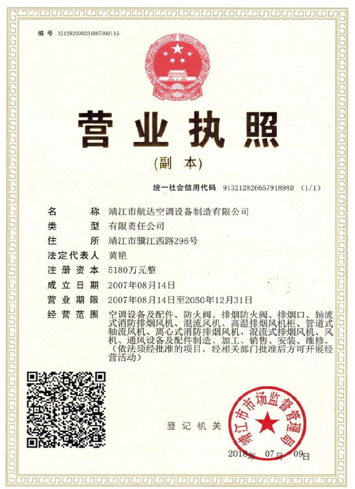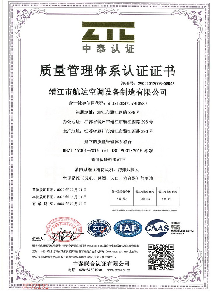 靖江市航達空調設備制造有限公司位于長三角經濟地帶、長江之濱江蘇省靖江市,現有京滬高速、新長鐵路南北貫穿靖江市區兩側,交通十分便捷,物流業發達。        公司主要產品有:防火閥、排煙防火閥、排煙閥、板式排煙口、軸流(混流)式消防排煙風機、離心式消防排煙風機、組合式空調器、變風量空調器系列、風機盤管系···…
